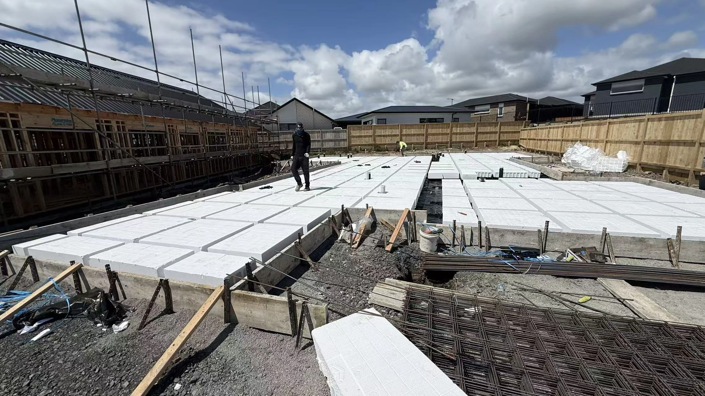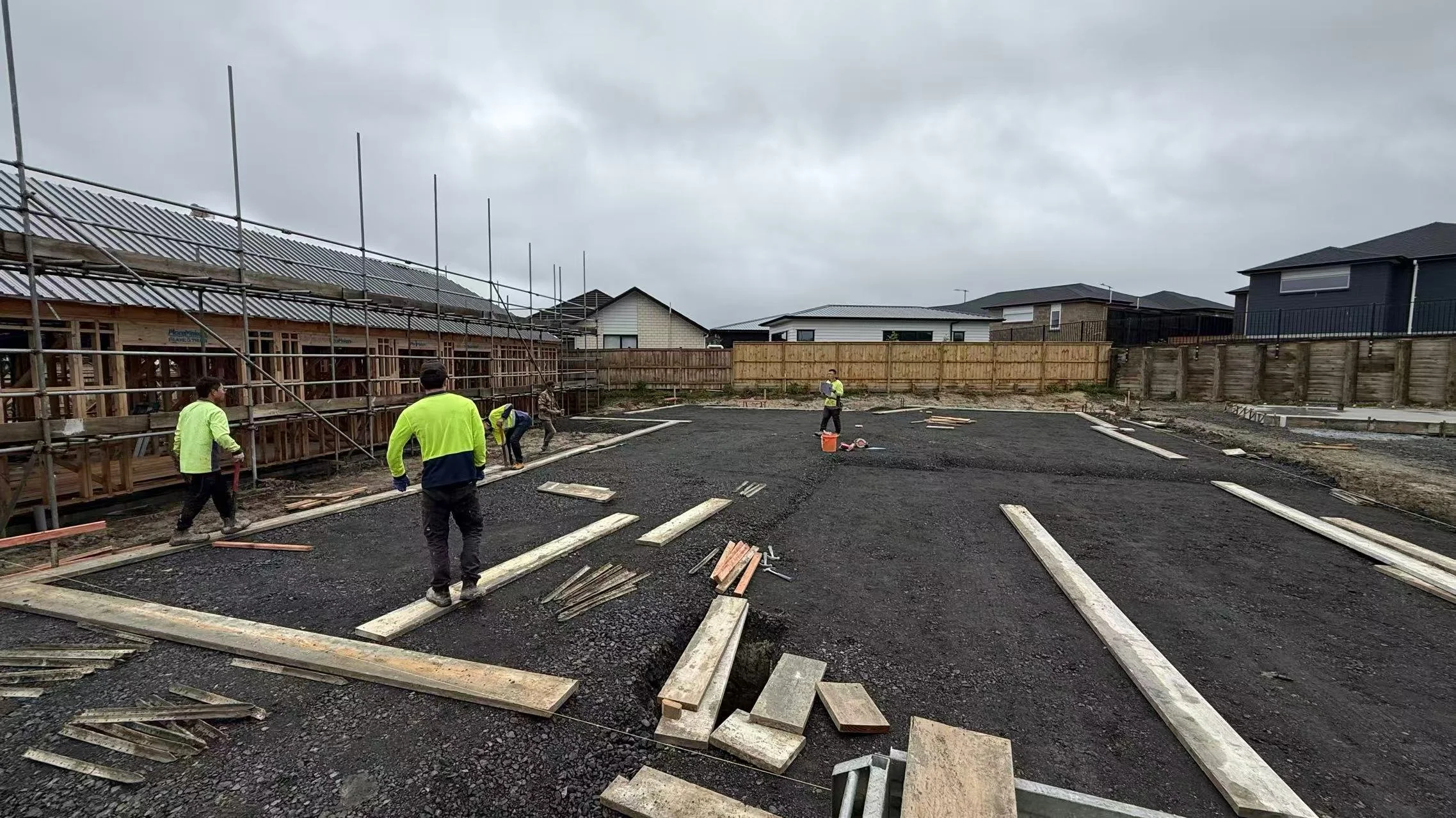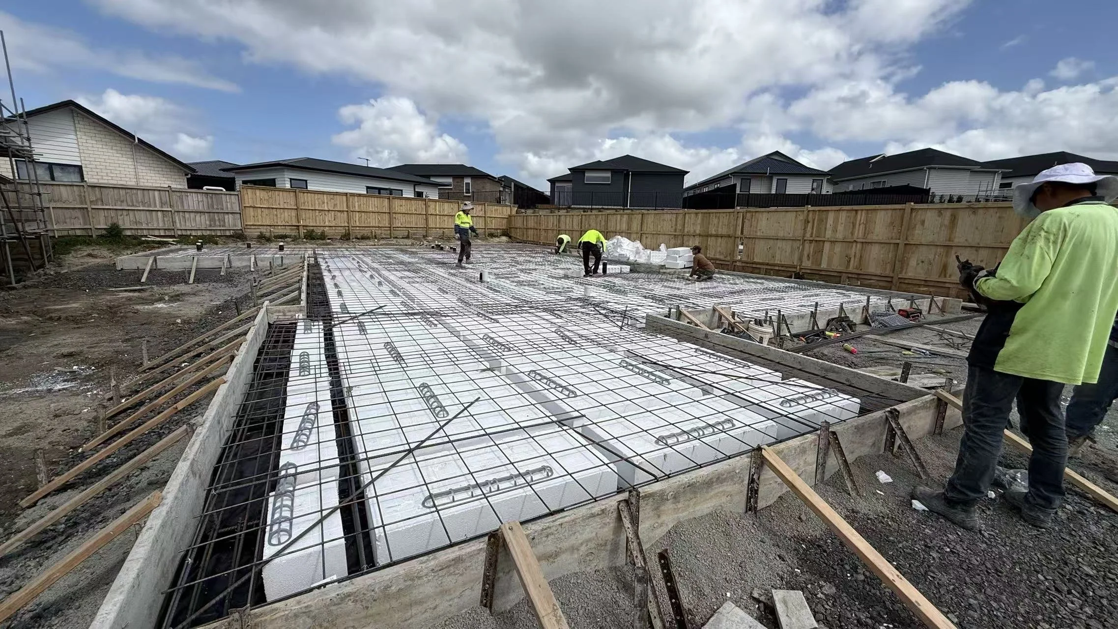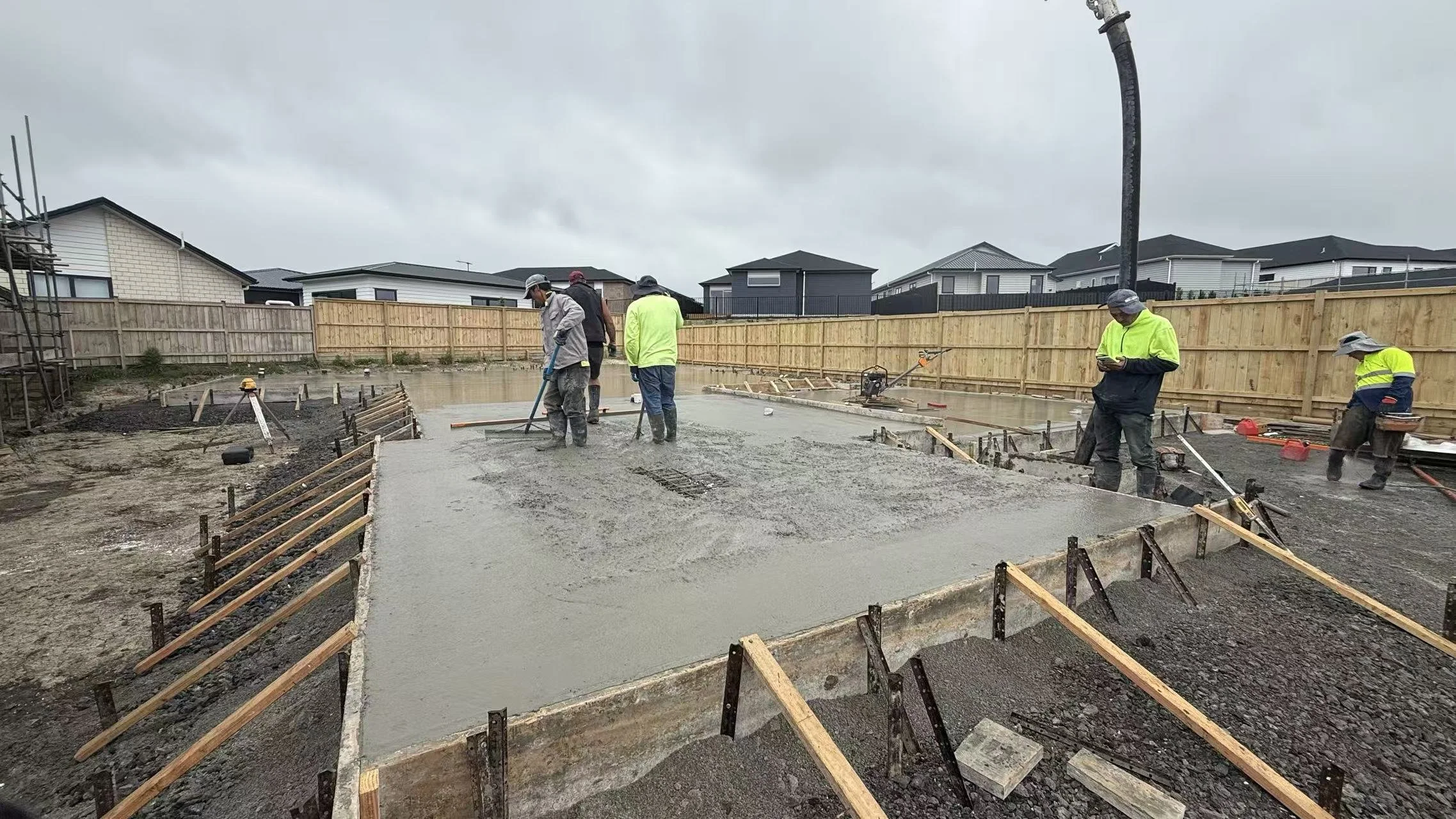 Concrete Laying: All associated concrete placing, levelling, and finishing for the foundation system and footings.